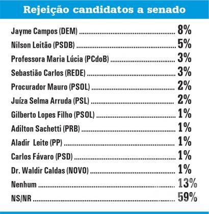 Nilson Leitão é o segundo colocado, com 5%, seguido por Sebastião Carlos e Maria Lúcia, com 3%, cada. A juíza aposentada Selma Arruda e o Procurador Mauro têm 2% de rejeição. Fávaro, Sachetti, Caldas, Gilberto Lopes e Adir Leite aparecem com 1% de rejeição dos eleitores.