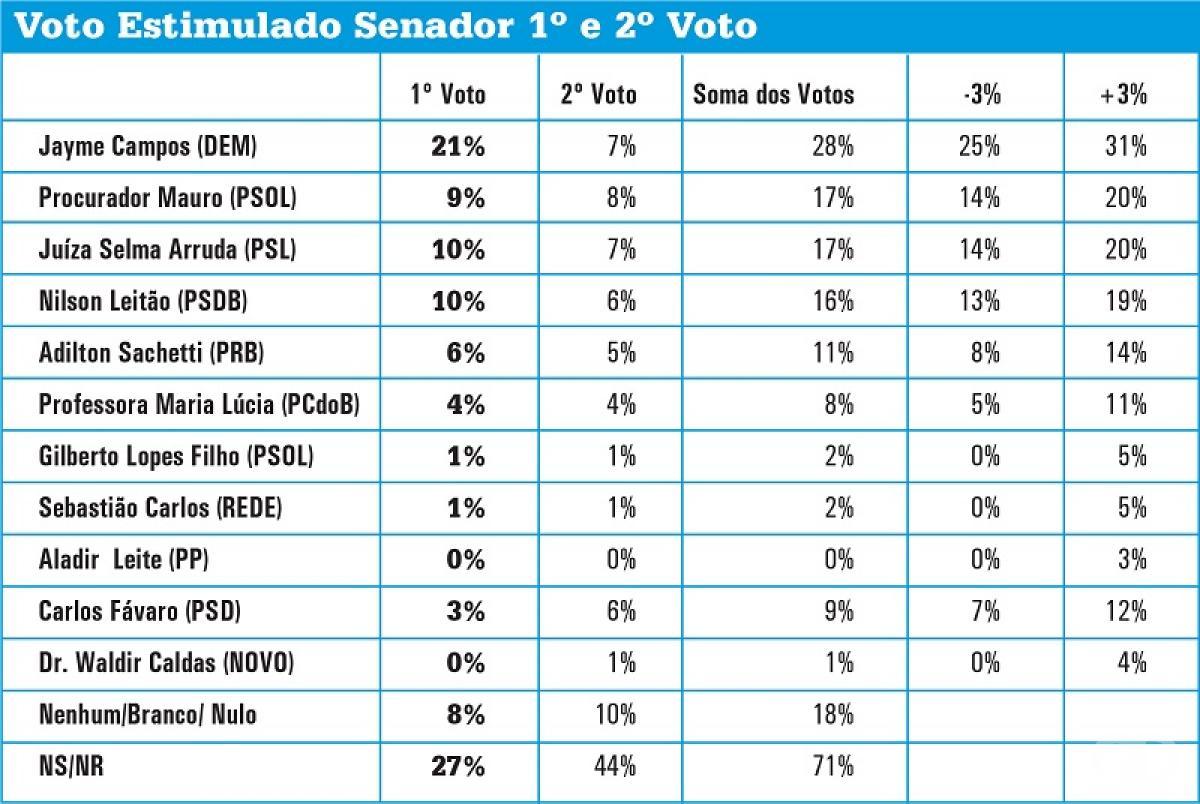 A segunda vaga, conforme o resultado apontado na pesquisa, está indefinida, tendo três candidatos empatados numérica e tecnicamente. Procurador Mauro (PSOL) e a Juíza Selma Arruda (PSL) aparecem com 17%, seguidos por Nilson Leitão (PSDB), que tem 16%.
