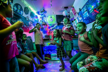 Crianças dentro da van movida a energia solar DA ASSESSORIA
